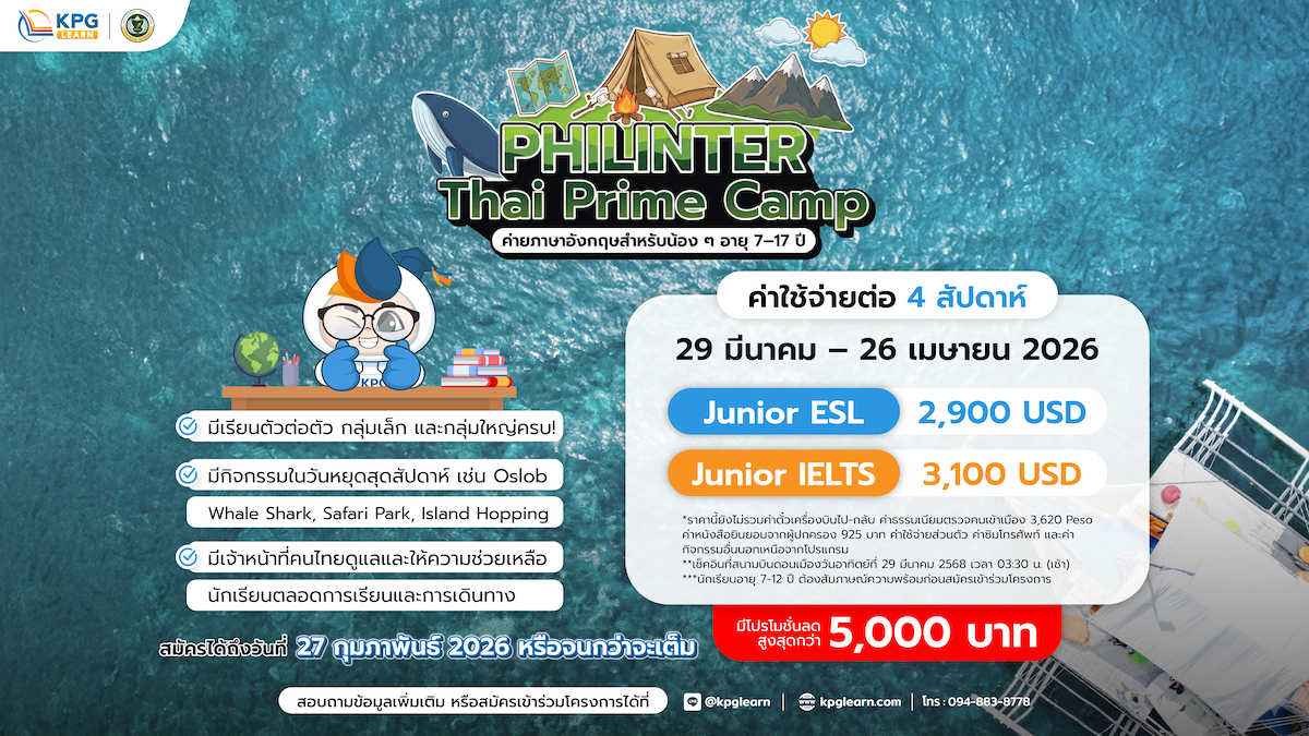 ปิดเทอมนี้มาสนุกกับการเรียนภาษาอังกฤษที่ Philinter Academy เมืองเซบู ประเทศฟิลิปปินส์ กับ Thai PRIME CAMP 2026 ค่ายภาษาอังกฤษที่ออกแบบมาเพื่อให้น้อง ๆ อายุ 7–17 ปี ได้เรียนรู้ภาษาอังกฤษผ่านกิจกรรม ฝึกพูดจริงกับครูฟิลิปปินส์ และใช้ชีวิตในบรรยากาศนานาชาติแบบเต็มรูปแบบ!