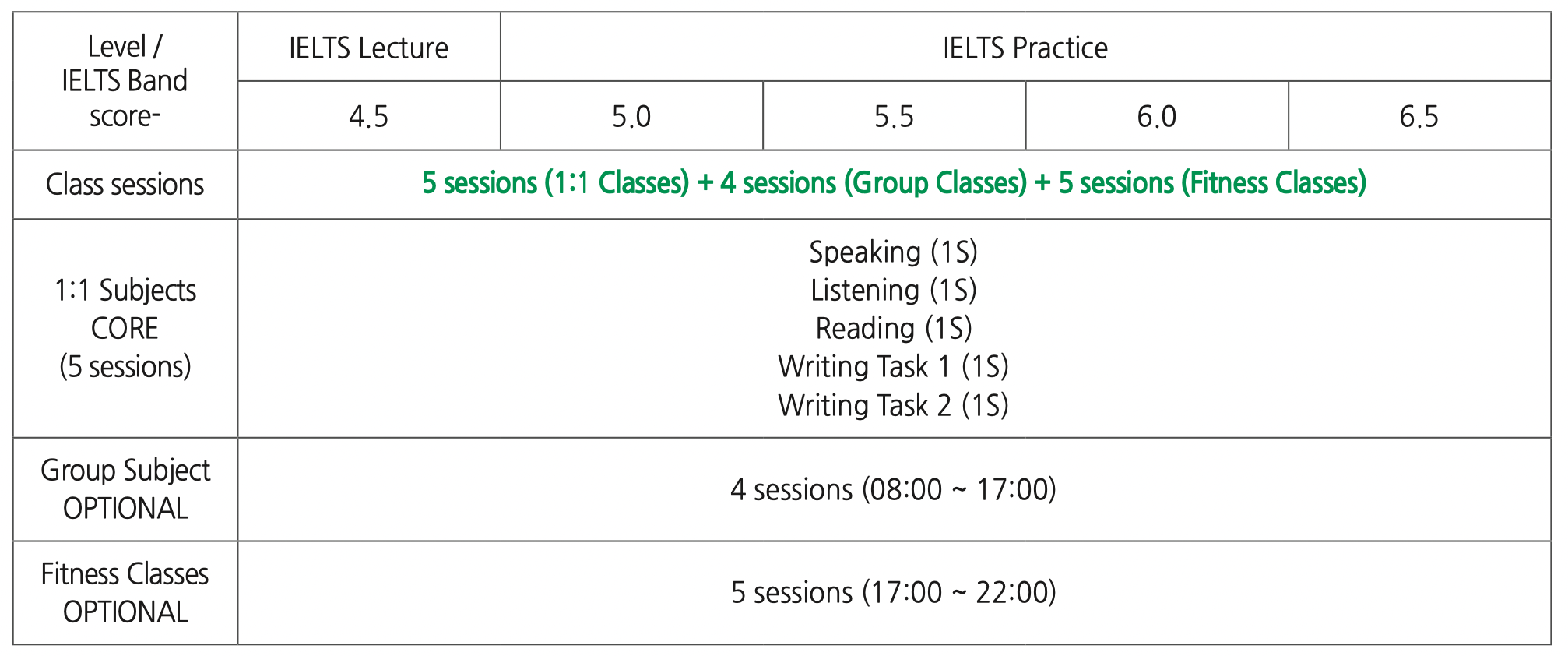 สำหรับการเรียนภาษาอังกฤษเพื่อการเตรียมสอบ IELTS ทั้ง General Training หรือ Academic เพื่อให้คะแนนที่สูงขึ้น หลักสูตรนี้จะแนะนำและสอนเนื้อหา เกี่ยวกับวิชาต่างๆ รวมถึงเทคนิคและวิธีการทำข้อสอบ IELTS ที่สำคัญ ผู้เรียนจะได้ทำแบบทดสอบเสมือนจริง ทุกวันศุกร์ เพื่อประเมินพัฒนาการของผู้เรียนอีกด้วย